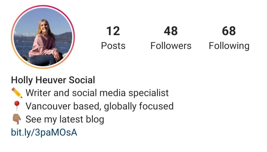 In your bio, you have 150 characters to tell everyone all about your business. Make it short and snappy, telling people who you are and what you do. I also like to include some key words for my industry to make my profile more searchable.