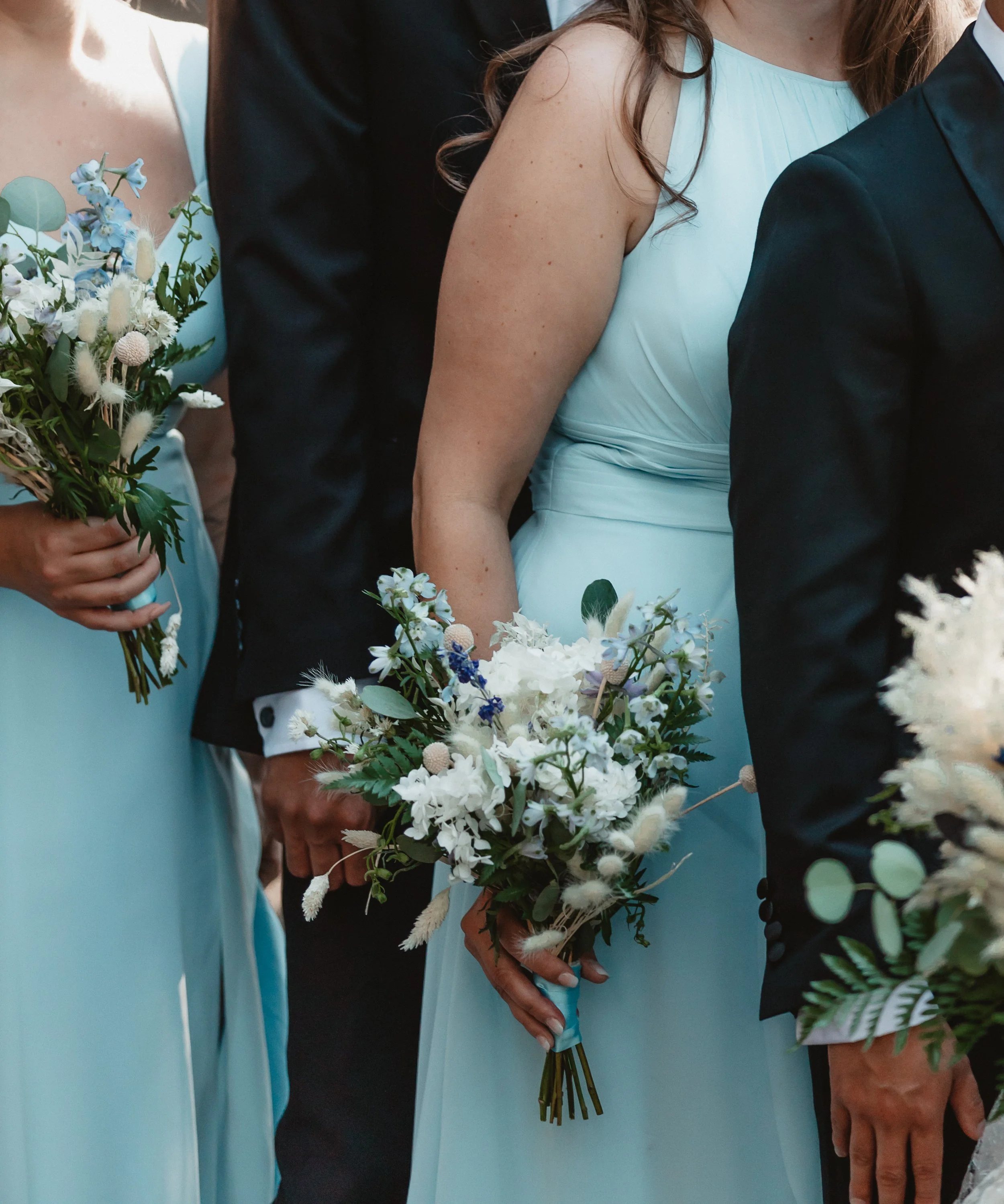 Close-up of people dressed in formal attire, holding floral bouquets at a wedding or formal event.